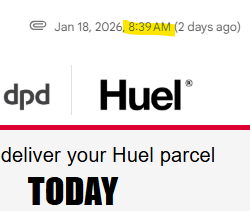 The subject “Your Huel order will be delivered today between…” stares back at me.